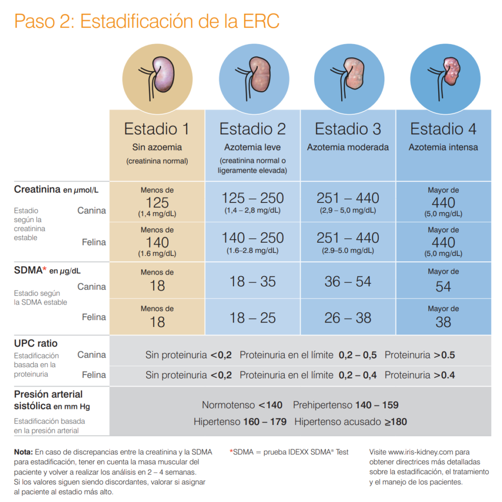 El tratamiento de la ERC se basa en su estadio, que se determina según los valores de creatinina sérica, la presencia de proteinuria y la tasa de filtración glomerular (TFG):